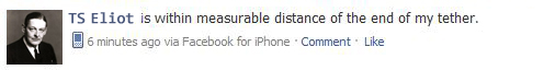 “Eliot’s description of himself as ‘within measurable distance of the end of my tether’ combines distress with elegance,” says a review of the new volume of the poet’s letters. Had Eliot had the chance to use Facebook or Twitter, that kind of remark would make a perfect update.